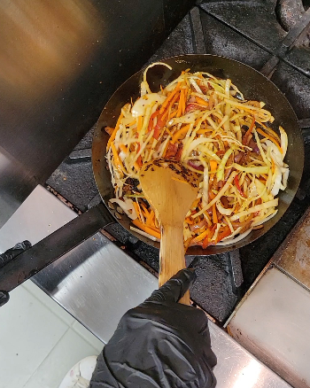 A vibrant filling with fresh veggies slowly cooked in a sesame-chili sauce, sprinkled with Feeney's Fungi Farm Umami Seasoning, bringing a perfect balance of wowzers for a unique and delicious twist.